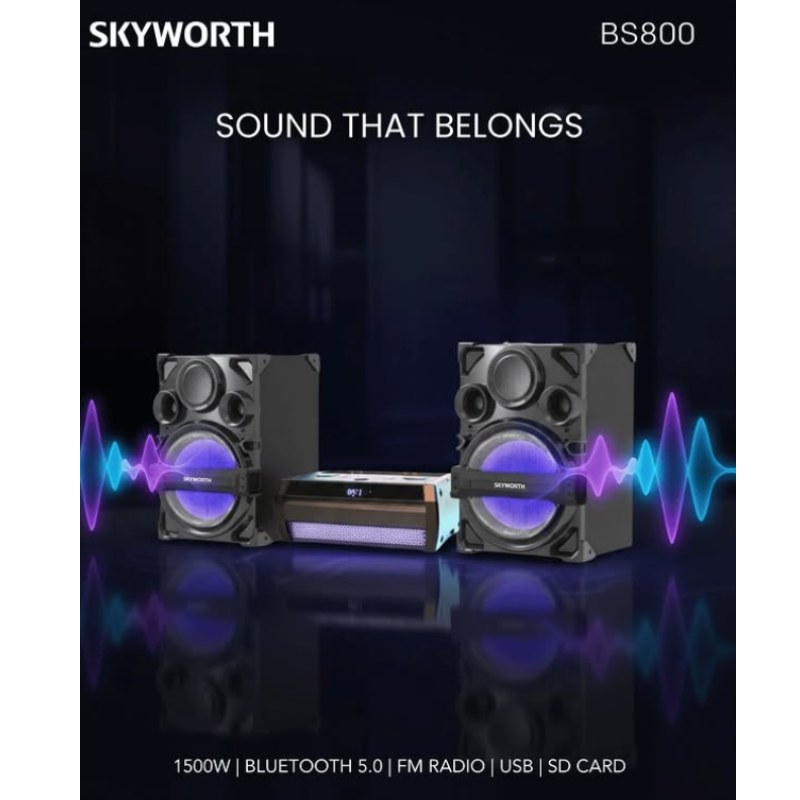 Experience powerful, crystal-clear sound with the Skyworth BS800 1500W . This sleek black mini HiFi system combines modern style with versatile functionality, featuring Bluetooth 5.0 for seamless wireless streaming, USB and SD card playback, and FM radio to suit your mood. Enjoy rich stereo audio from its 2.0 channel speakers enhanced by LED lighting for an immersive atmosphere. Easy to control with the included remote, it also supports AUX and optical microphone inputs, making it perfect for both music lovers and karaoke nights. Elevate your sound experience with Skyworth’s trusted quality.